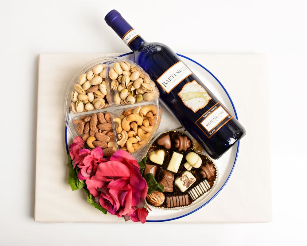Filled with a blue bottle of bartenura wine, a container of fresh-roasted nuts, a heart-shaped box of dairy Belgian chocolates, and a beautiful silk flower