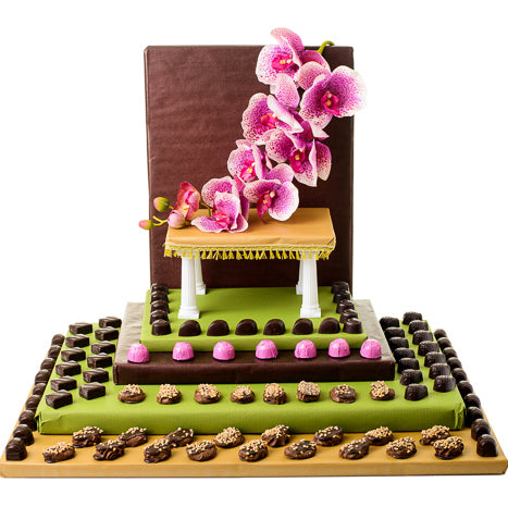 Beautifully presented and arranged, this multi-tiered presentation is graced with a chuppah and a stunning bright-pink orchid. Filled with 85 chocolates, this centerpiece is a showstopper. This gift will be remembered long after the last chocolate is consumed, savored and enjoyed.