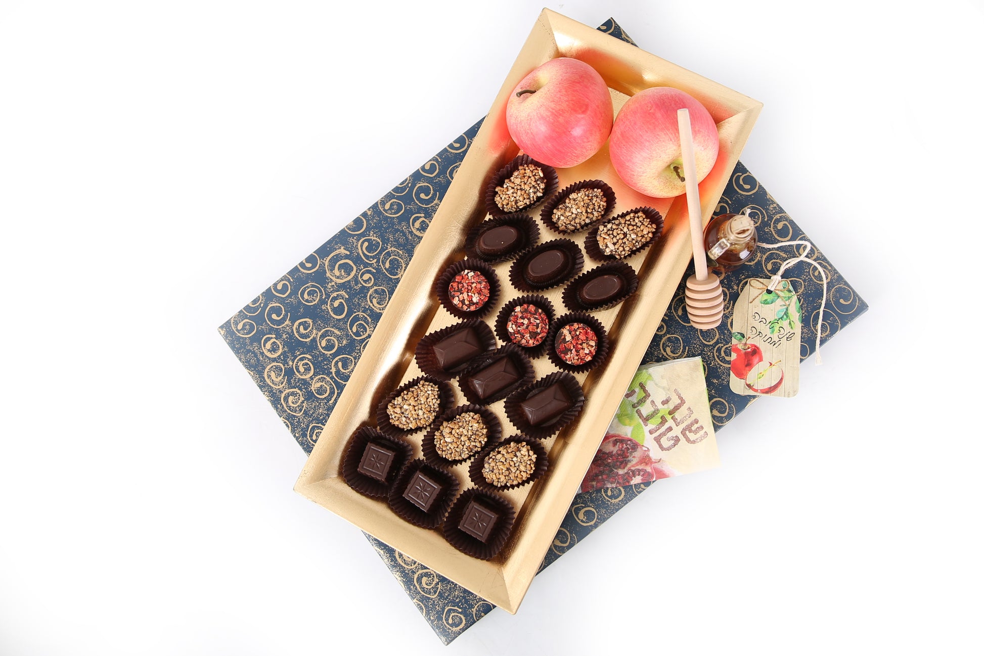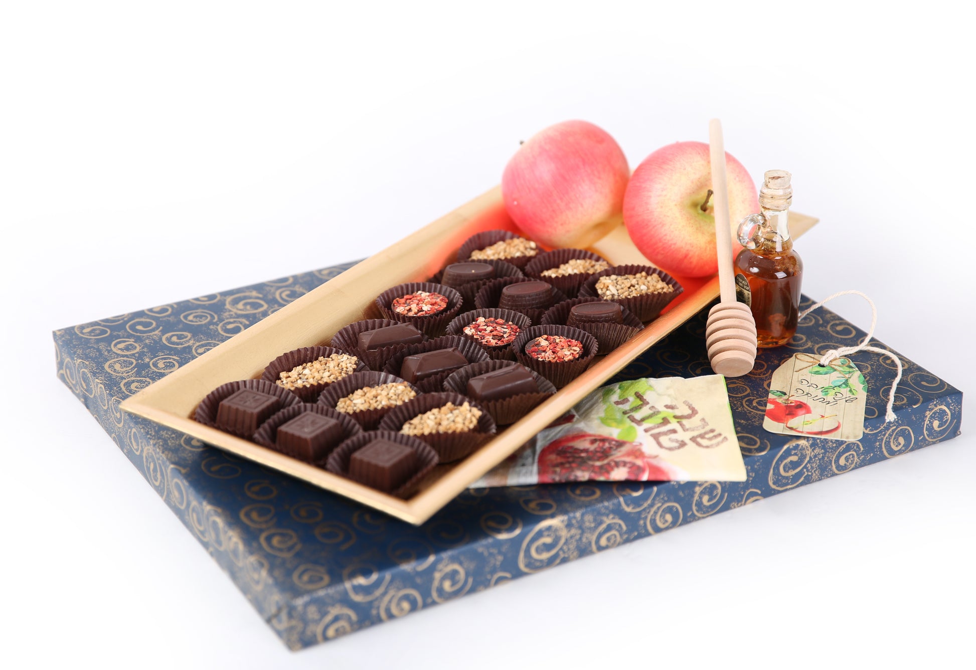 Contains 18 Belgian chocolates, a small jar of honey with a wooden honey dipper, and 2 decorative apples.