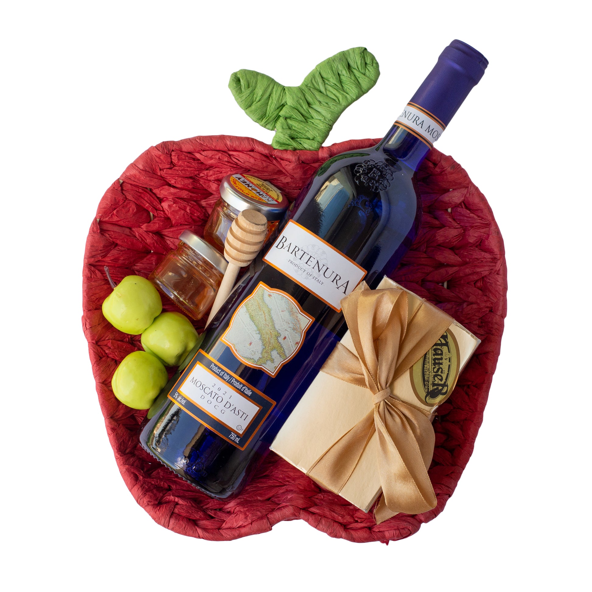 This delightful apple-shaped basket is filled with a blue Bartenura dessert wine, a box of dairy Belgian chocolates, 2 small jars of honey, and some decorative apples with a honey dipper.