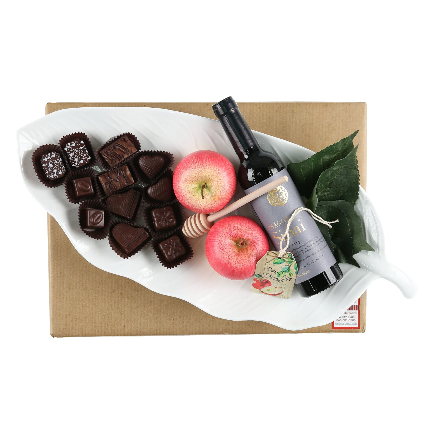 Contains small bottle of Sinai wine, 12 Belgian pralines, 2 large decorative apples and a wooden honey dipper.